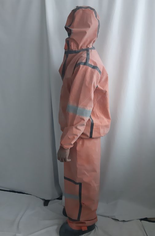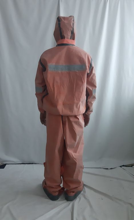 Костюм защитный Л 1 с СОП изготовлен из прорезиненной ткани арт. Т-15 оранжевого цвета на куртке и брюках светоотражающие полосы. Швы костюма Л-1 и места притачивания деталей проклеиваются специальной защитной лентой и усилителями. Манжеты на рукавах надежно облегают запястья.